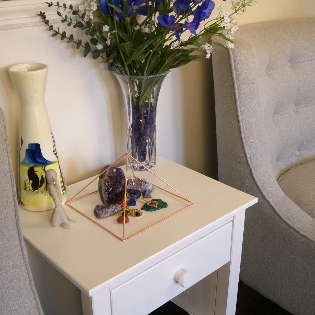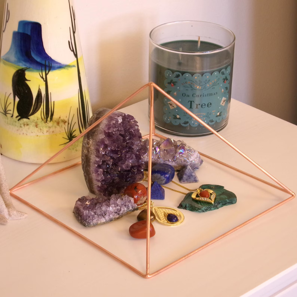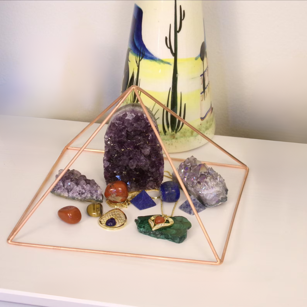 Aseta esine tai ruoka pyramidin alle energisointia varten. Tärkeää: yksi sivuista tulisi suunnata pohjoiseen – näin pyramidin energeettinen voima aktivoituu. Pyramidin voi myös ripustaa sängyn yläpuolelle! Lue lisää blogistamme.